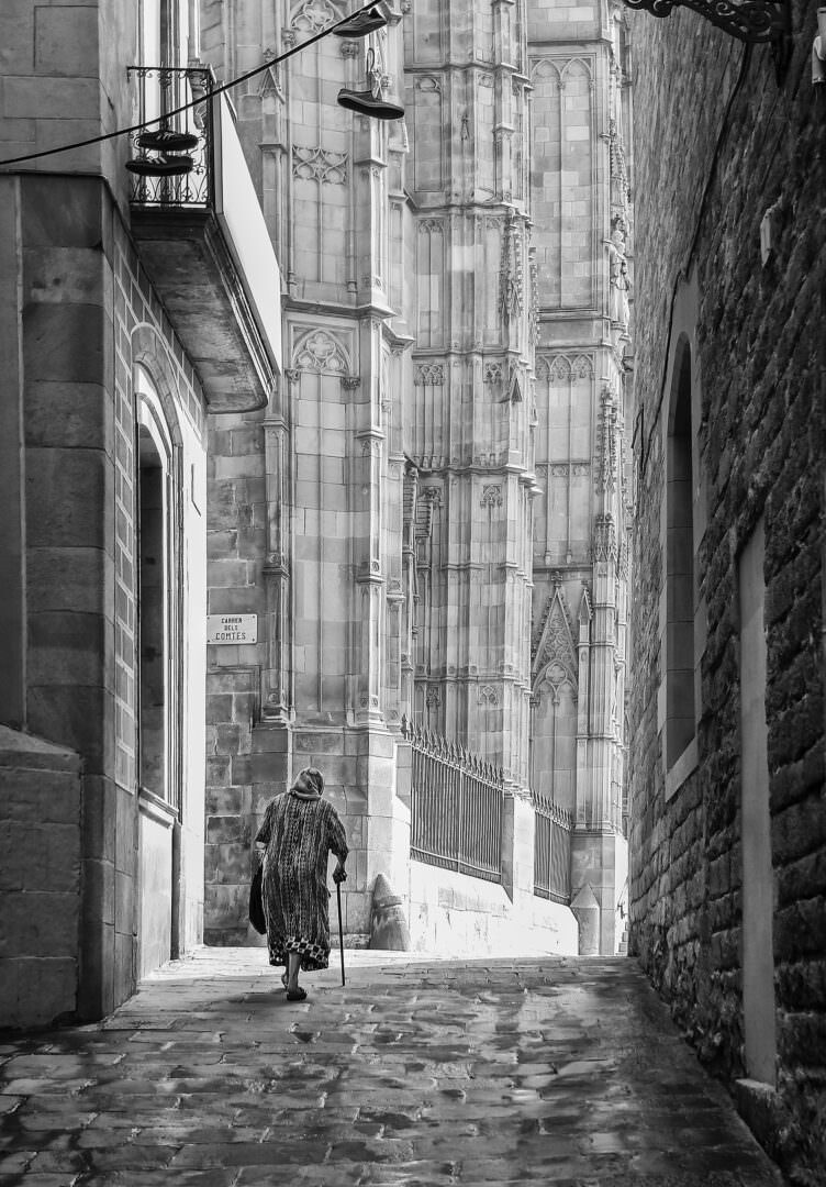 El carrer estret, de murs alts, em va demanar col·locar ràpidament la càmera en posició vertical. Vaig enquadrar de manera que el pla inclogués suficients detalls del carrer, vaig avançar uns passos perquè, al fons, s’apreciessin més detalls de la catedral, i vaig disparar. A mig carrer la dona va desplaçar-se a l’esquerra, de manera que la figura ja no quedava centrada, moviment inesperat que vaig celebrar. Va quedar així situada, uns breus instants, en un punt fort del pla, i vaig tornar a disparar quan ja pràcticament arribava al carrer dels Comtes, a la zona més il·luminada, de manera que figura i fons donaven una imatge compensada i amb prou contrast.