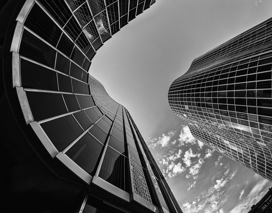 Després de provar diferents òptiques, vaig optar, finalment, per un ull de peix. Em vaig situar molt a prop d’una de les torres i vaig fer diferents preses enquadrant cap amunt. L’augment dràstic de l’angle visual va permetre incloure al pla la part superior d’una altra torre, i es generava una distorsió que accentuava les sinuositats de l’edifici.