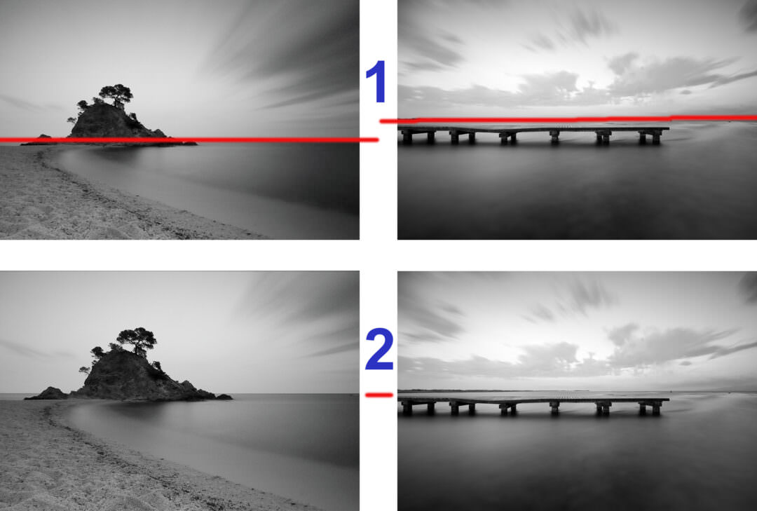 En fotografia de paisatge molt sovint trobem horitzons formats pel cel i el mar, o pel cel i el terra. Durant la maquetació em vaig adonar que quan hi ha dos horitzons de dues imatges diferents, l’un al costat de l’altre, cal que ambdós coincideixin horitzontalment, tret que la diferència entre tots dos sigui prou important.