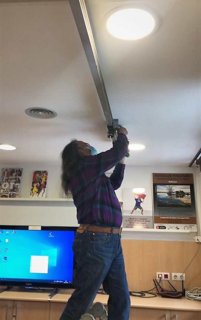 Però encara n’hi ha més, també disposem de fons per fer retrats: un fons blanc i un altre de negre de tela plàstica, així com un fons vermell de cartró que es pot anar tallant i desestimant a mesura que es va utilitzant. La seva mesura és de 3 m d’ample per 11 m de llarg. Ens els ha cedit gratuïtament en Jaime Mediavilla, també membre de la Junta. Aquests fons estan enrotllats i pengen d’uns suports i ganxos provinents de l’estudi d’en Joan. Es poden desplegar gràcies a una cadena que hem instal·lat. Hem hagut de fer força bricolatge!