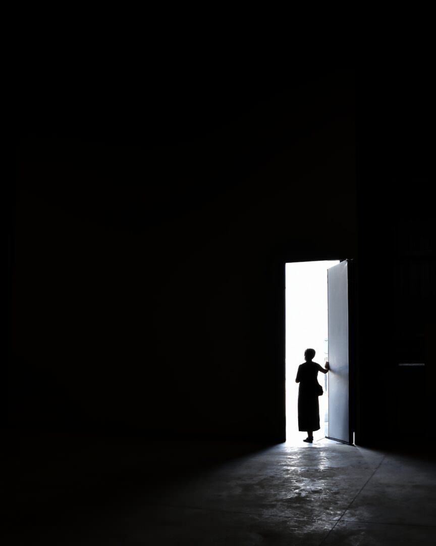 Com que venia de fer fotos amb força contrast perquè havia estat en un entorn amb poca llum d’ambient, però amb alguns espais il·luminats, com el de les obres exposades, doncs, en principi, la foto no va sortir tan fosca com hauria volgut. Vaig veure que amb els valors utilitzats (ISO 400, f/5 i 1/100 s) es podien percebre massa detalls de la gran porta de sortida, que distreien molt d’allò que era la meva intenció mostrar a la foto: la transició entre ambdós espais. Per això, en un procés d’edició molt senzill, solament vaig necessitar enfosquir la foto, de manera que només fos visible la figura sortint i la llum de l’entrada reflectida al terra.