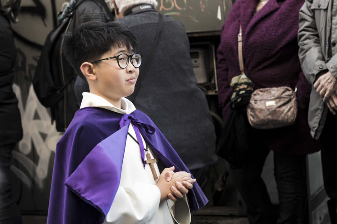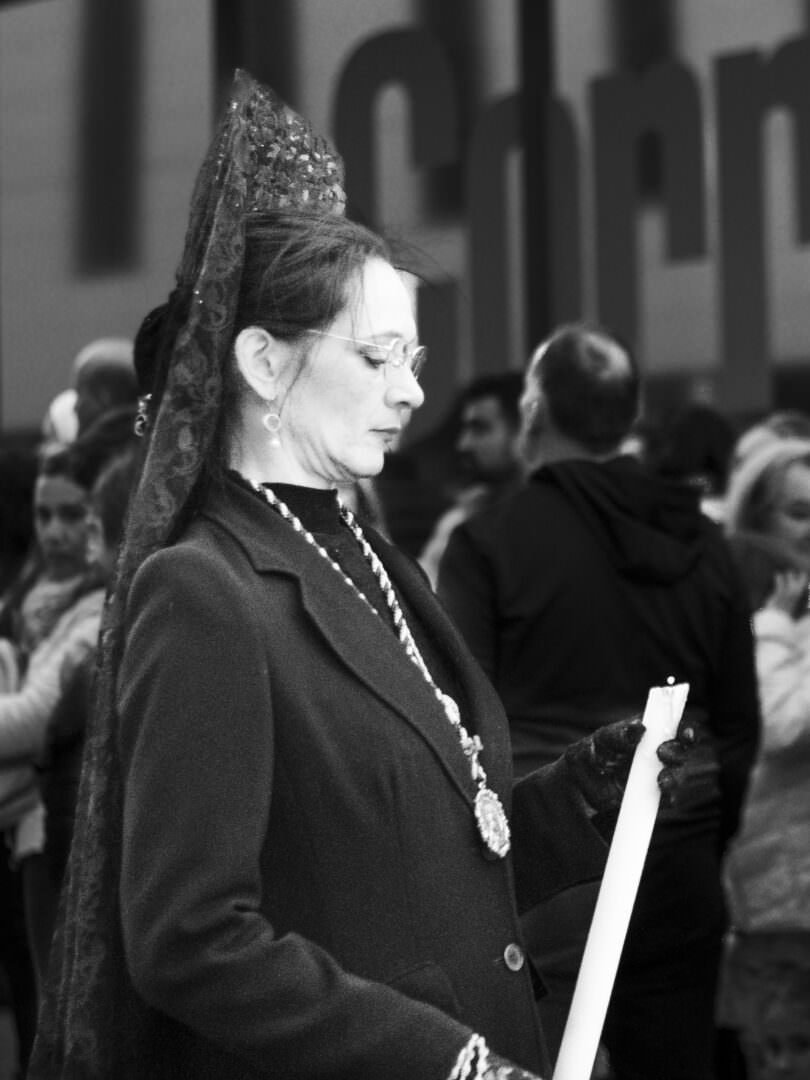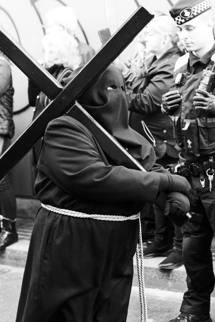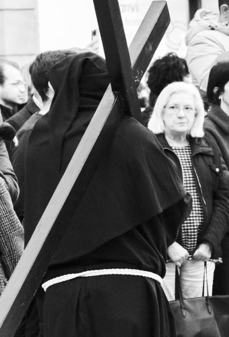 Un cop situat en el context, a part de fer les “postals” típiques de Setmana Santa, vaig voler copsar l’ambient que s’hi viu. Així, vaig intentar captar les mirades tant dels participants com dels espectadors. En algunes de les fotos val la pena entretenir-se a observar les diferents mirades: una senyora amb cara de sorpresa davant de la penitent, un urbà encuriosit amb el pas d’una penitent, una mirada directa d’un nazareno portador de la creu de difícil interpretació, etc.