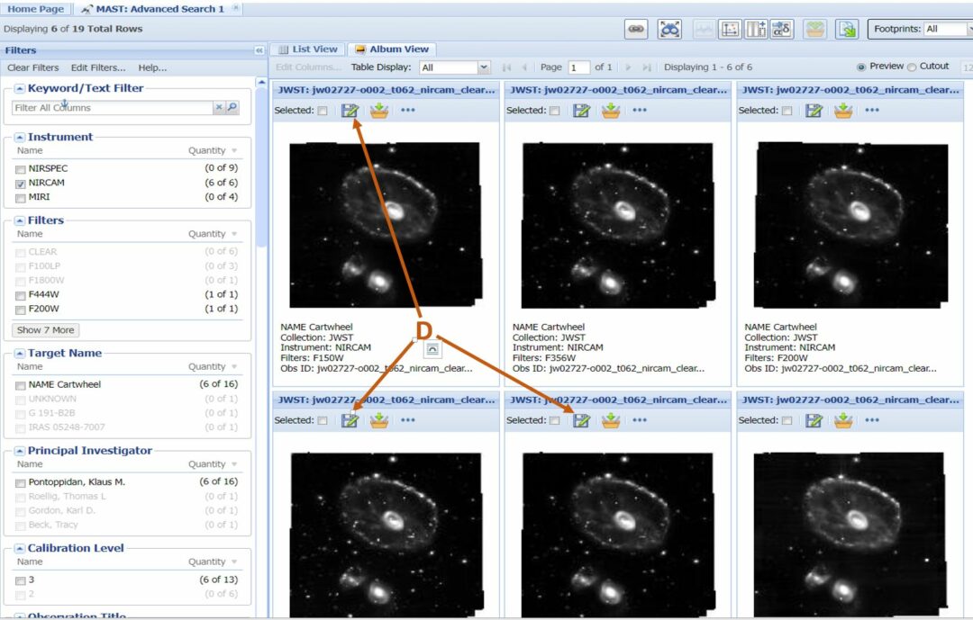 Com havíem dit, per simplificar utilitzarem només tres imatges per aplicar-hi els tres colors RGB. En necessitem una de longitud d’ona petita per al blau, mitjana per al verd i gran per al vermell. Les freqüències les podem deduir pel filtre aplicat a la captació. En aquest cas tenim els filtres des del F090W al F444W: aquestes xifres són àngstroms (un submúltiple del nanòmetre (1 Å = 0,1 nm). En qualsevol cas, el F090W seria la longitud d’ona més petita i el F444W la més gran. I podem triar el F277W per a la intermèdia, a la qual aplicaríem el color verd. A l’hora de seleccionar les imatges, cal que ens fixem en la qualitat de cada una i en el seu soroll de fons, i triar-ne una d’alternativa si cal. Descarreguem les tres imatges seleccionades, una per una, clicant a la icona corresponent de descarregar (D) de cada una.
