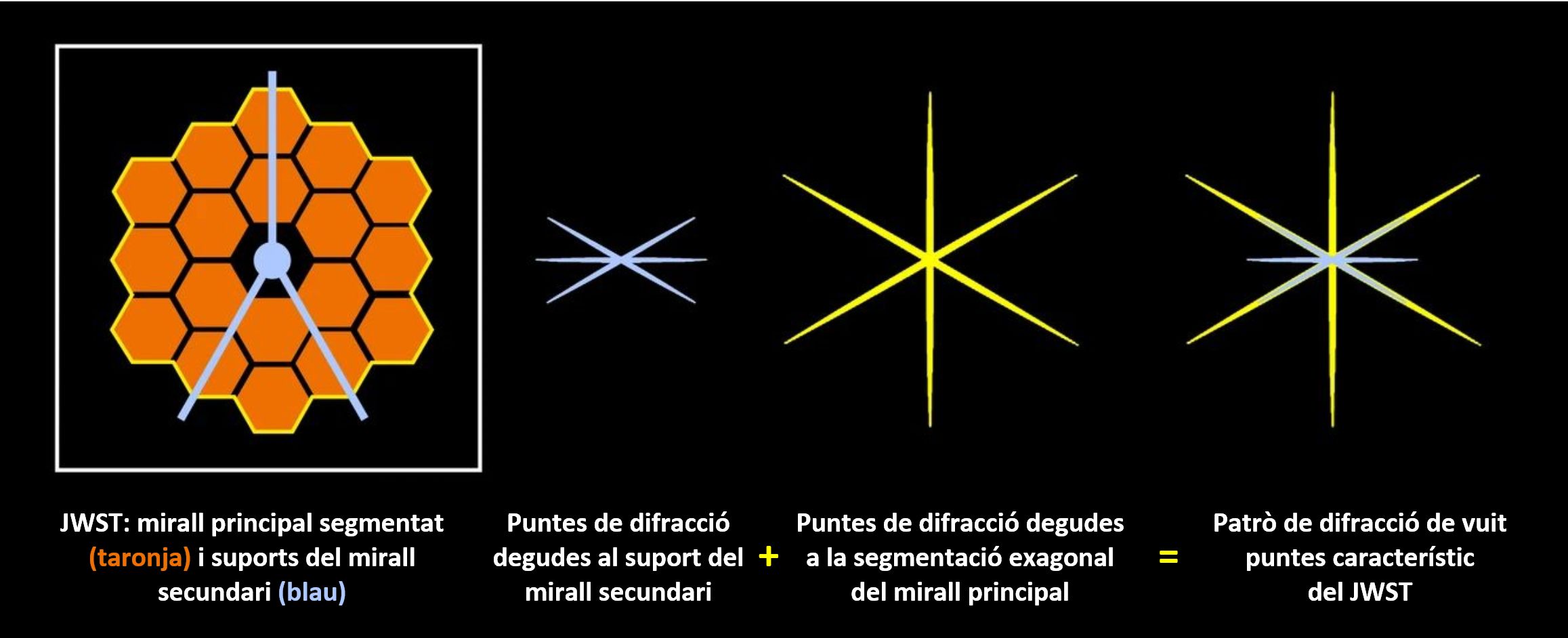 Un apunt final sobre les imatges del telescopi James Webb. Criden l’atenció els curiosos raigs que surten de les estrelles més brillants. Podríem pensar, per similitud amb les nostres càmeres, que es deuen a la difracció provocada pel diafragma de les lents. Però al JWST no és així: en aquesta pàgina i en les imatges de sota s’explica el motiu.