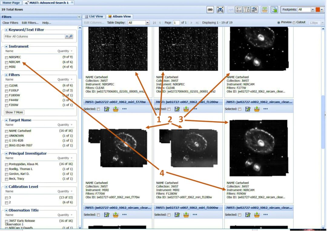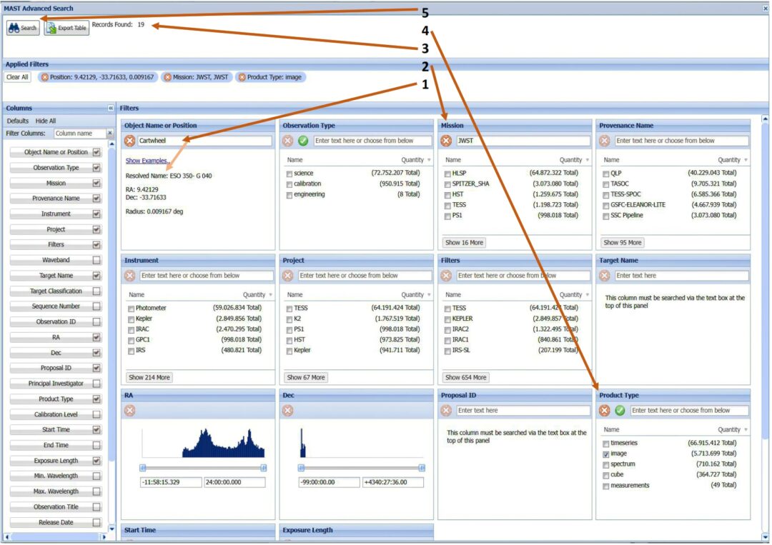 Accedim a la pàgina de cerca al MAST del STSCI, en la qual cliquem directament l’enllaç de la part superior que diu “Advanced search”, que ens porta a la pantalla de la imatge adjunta, la qual es pot ampliar clicant-hi a sobre. A la imatge ja es veuen algunes dades que haurem d’introduir, començant pel nom, “Cartwheel” (1) i la Missió, “JWST” (2) . En introduir cada dada, fem intro perquè s’actualitzi el nombre d’elements trobats (3). En introduir el nom, a sota ja ens indica si l’ha reconegut. Si no, hauríem d’utilitzar una altra nomenclatura o provar amb altres camps de les dades que tenim, com l’instrument, etc.